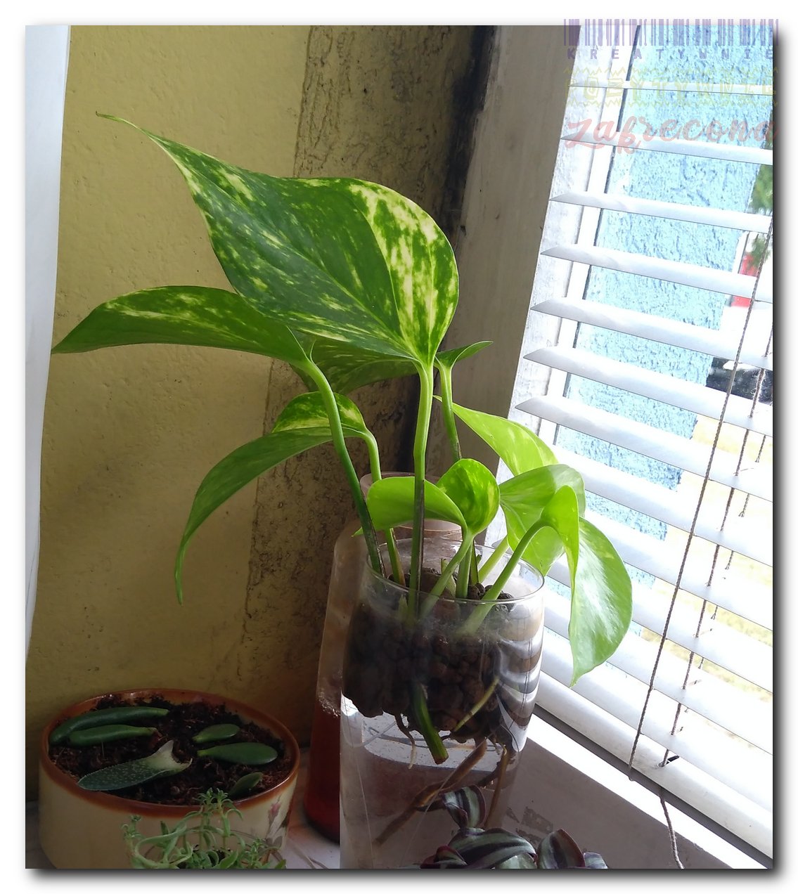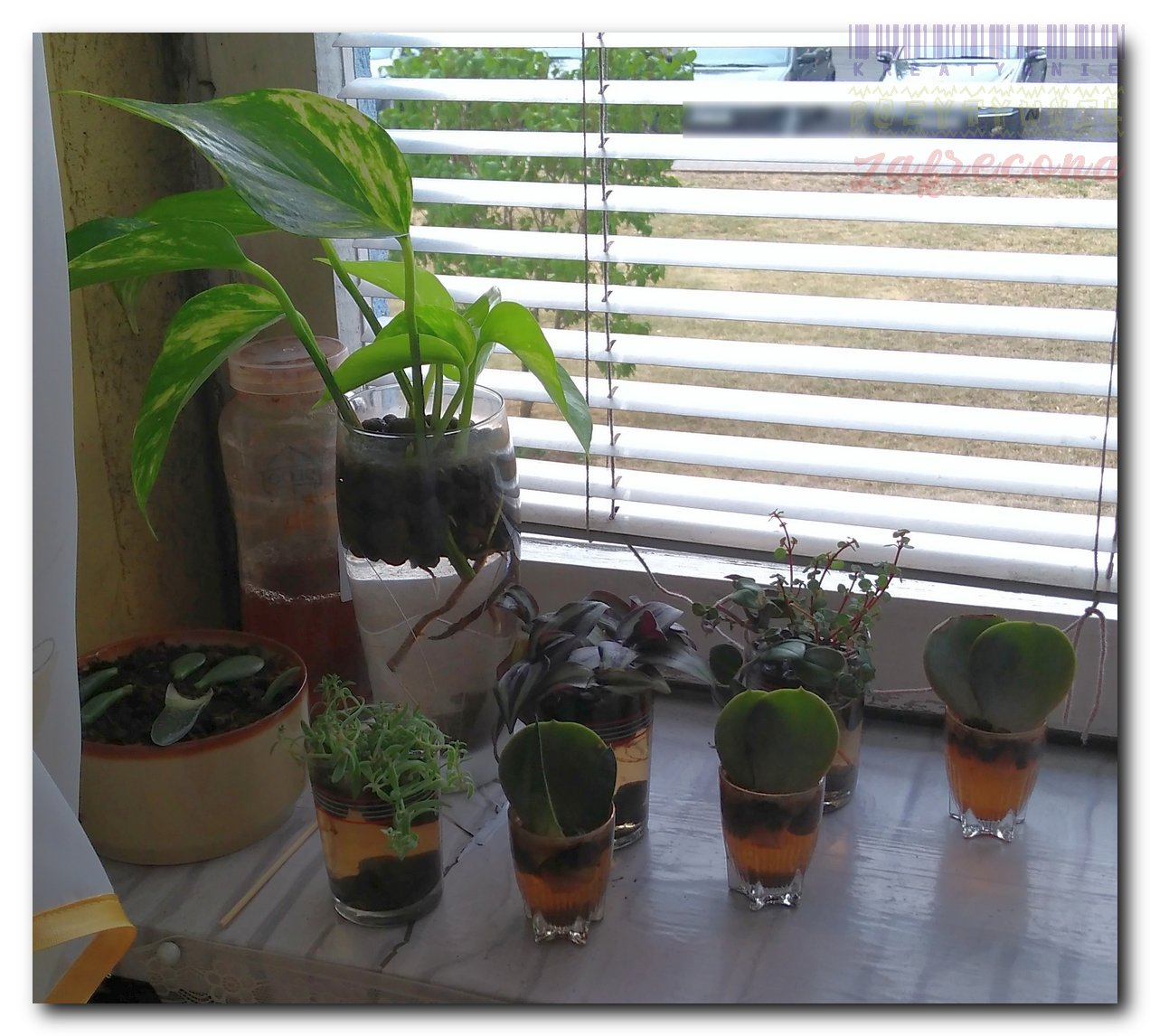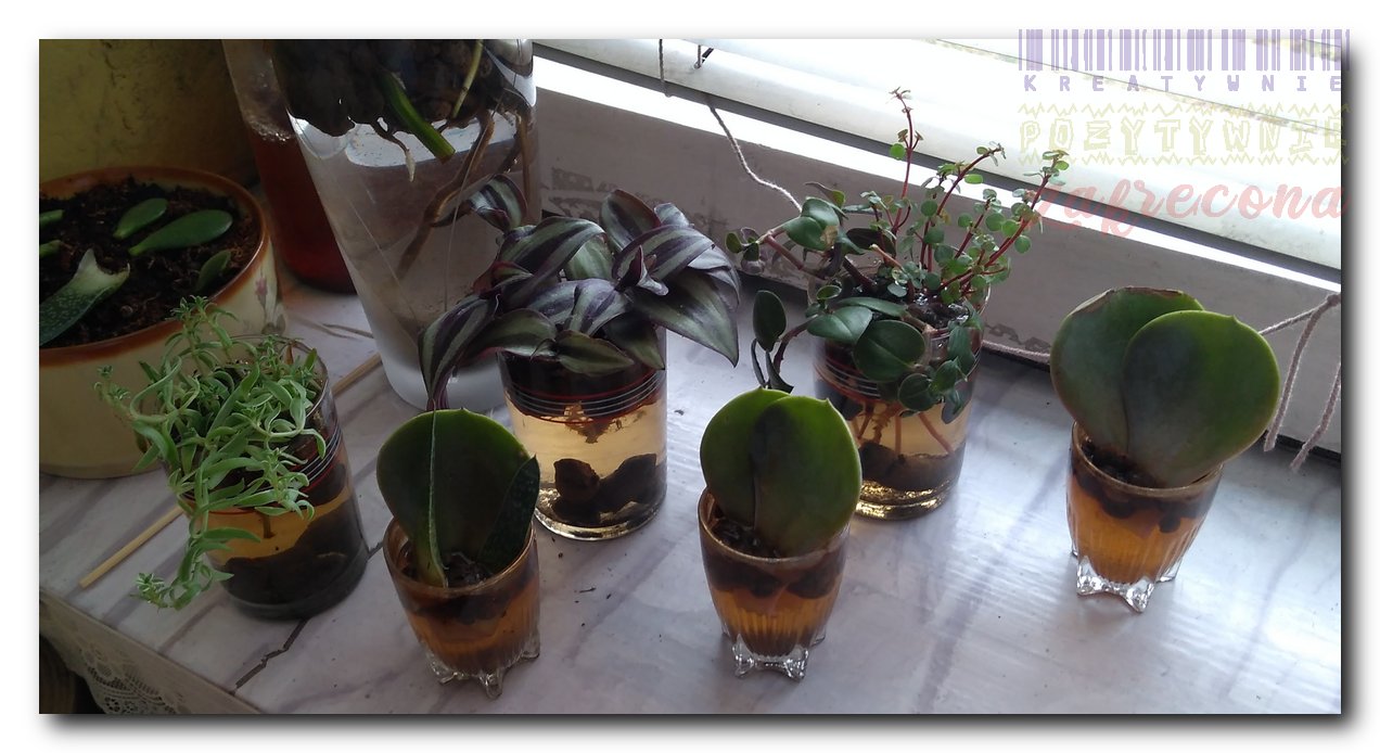 Większość Trzykrotek ma już solidne korzonki, najsłabiej idzie Żelkowi. Eksperymentalnie włożyłam do wody listki Haworsji i Eszewerii Lilaciny.