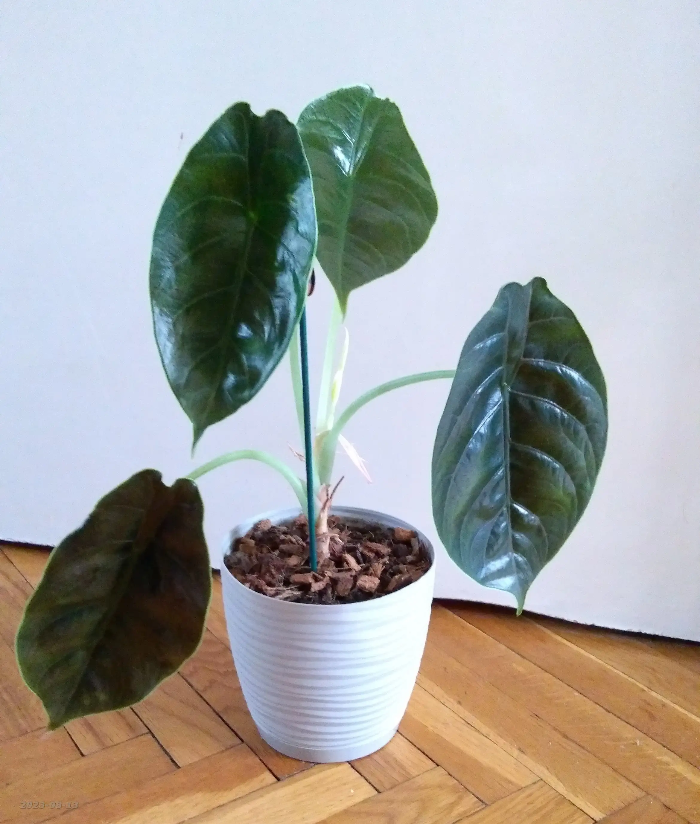 Myślałam, że Welwetka wypuści dużego liścia, bo stożek wzrostu był grubaśny, ale to kwiatostan i to podwójny. Okazuje się również, że maleństwo w końcu wypuszcza nowego liścia.