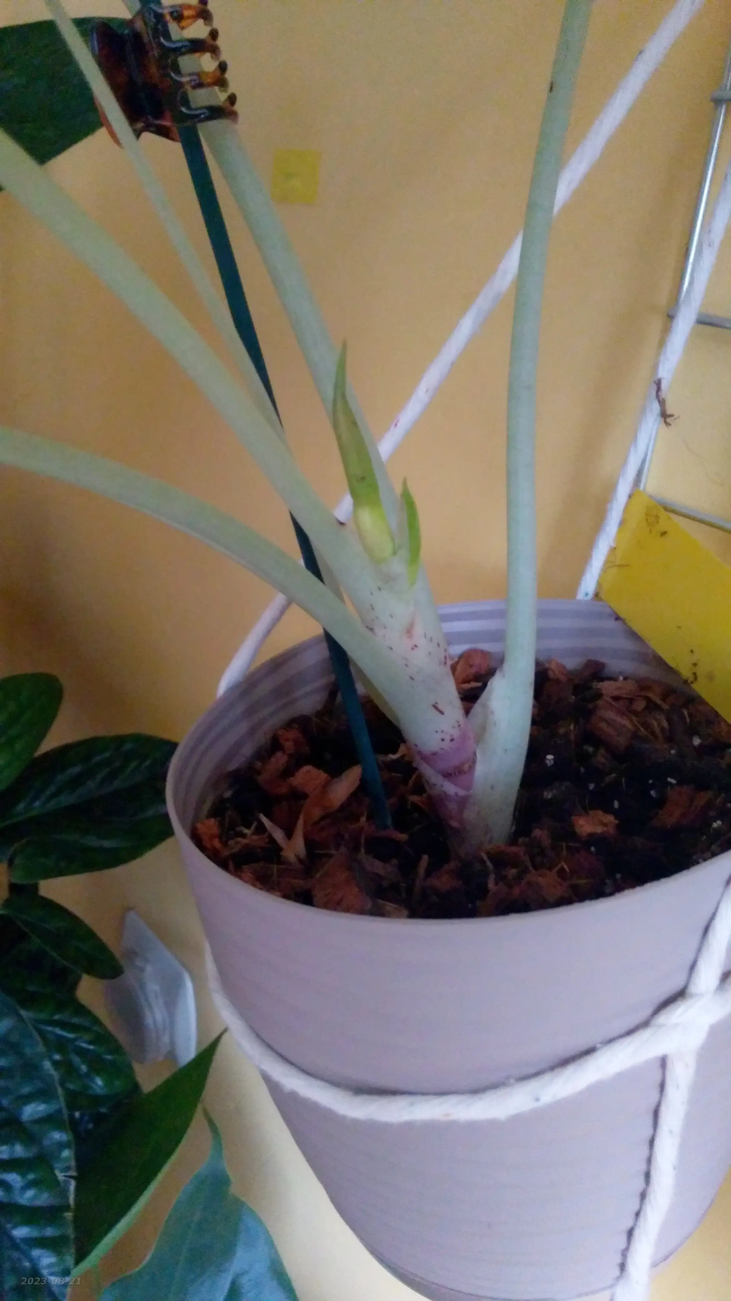 Ostatnio zauważyłam pojawiające się plamy aż na 3 liściach. Myślałam, że coś niedobrego się dzieje, ale okazało się, że to tylko efekt kwitnięcia. Na wszelki wypadek usunęłam kwiatostan, żeby nie obciążać rośliny. Oprócz tego, dosadziłam jej malucha z nowej bulwy. Niestety liść coś się poddaje. No ale zobaczy.